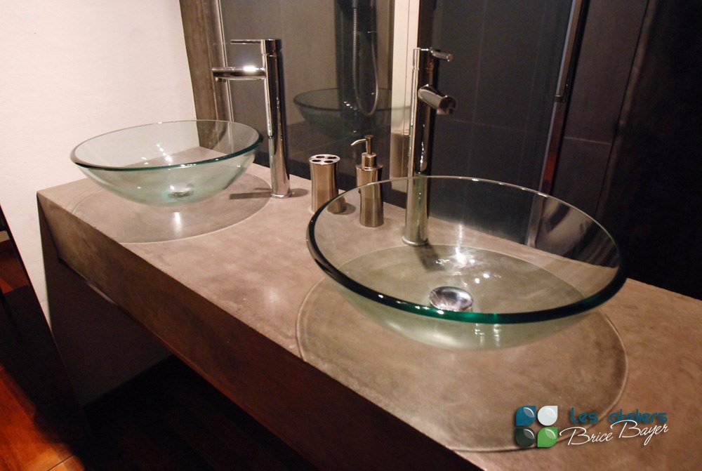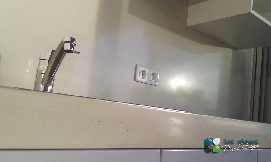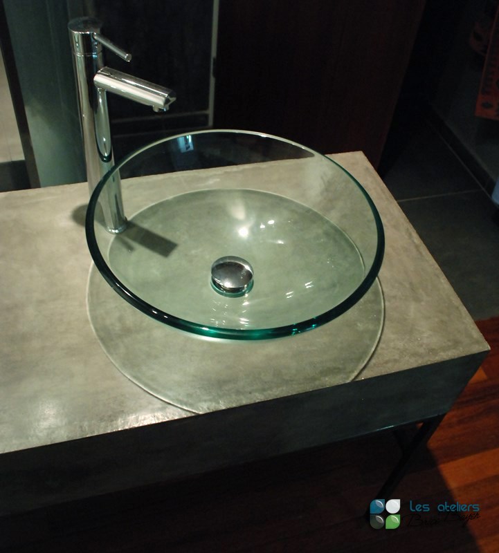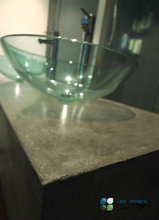 Description : Le plan vasque de salle de bain est réalisé en béton ciré brut