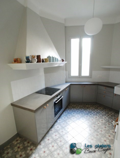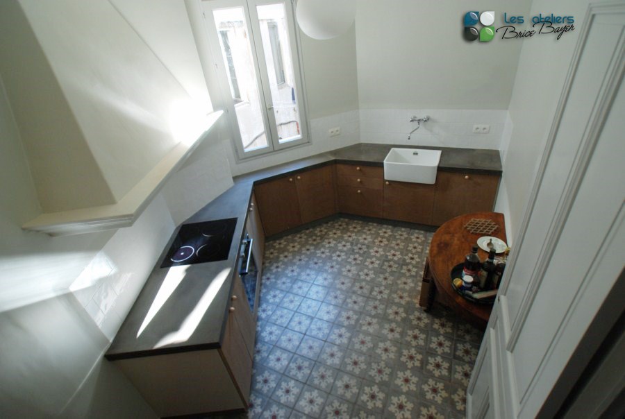 CUISINE CONTEMPORAINE PLAN DE TRAVAIL EN BETON, CARREAUX DE CIMENTS PROVENCAUX AU SOL