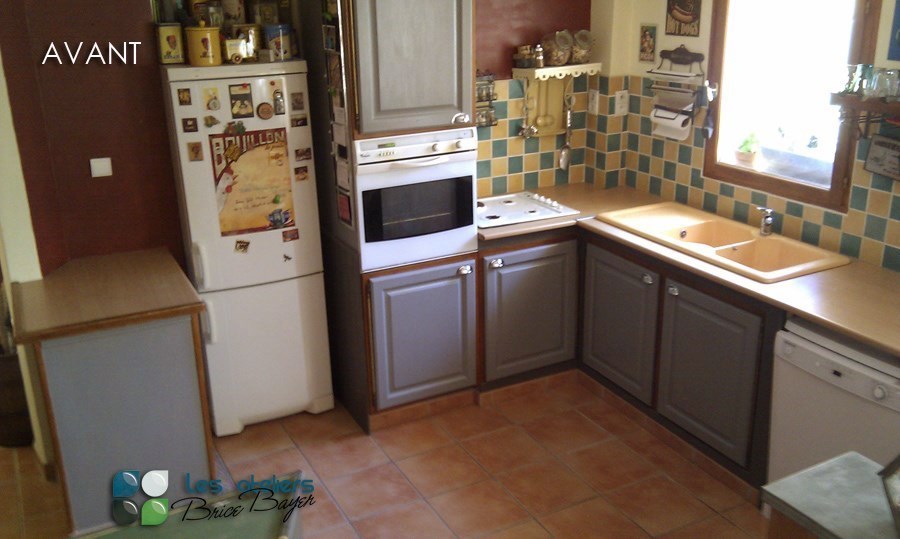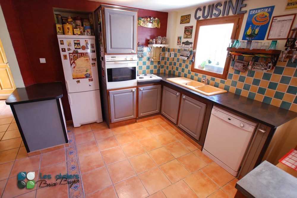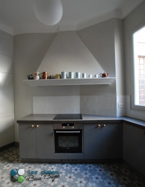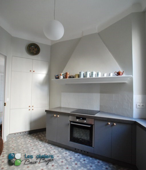 Restauration des carreaux de ciments au sol, réalisation sur mesure des caissons de cuisine, portes en mdf hydrofuge laquées