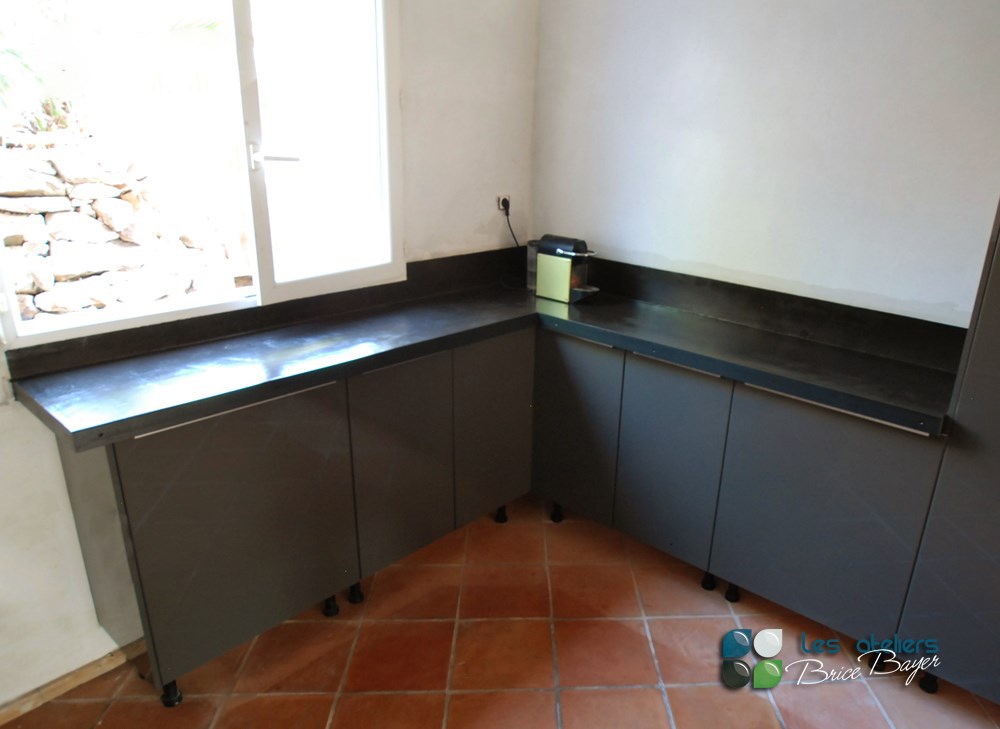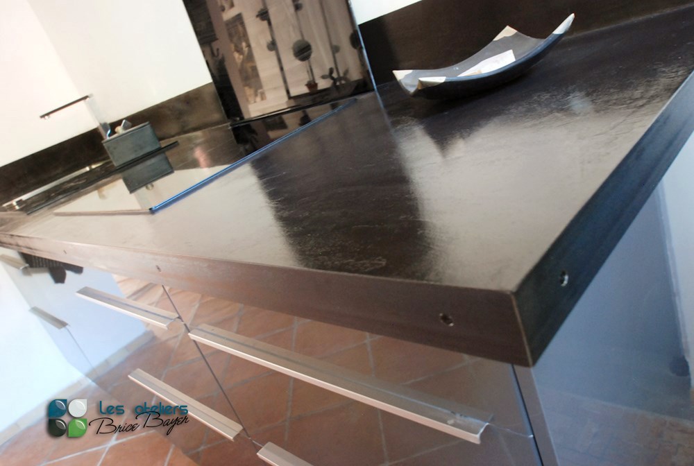 Description : Réalisation du plan de travail en béton ciré avec les champs en acier noir brut vernis