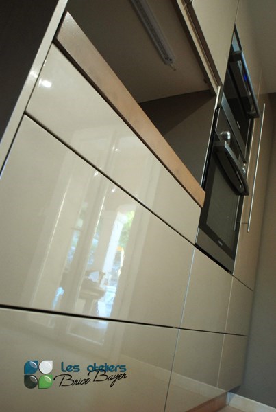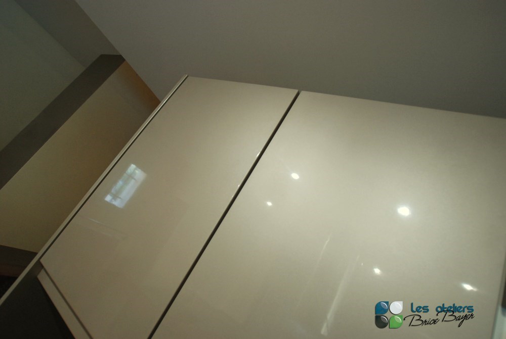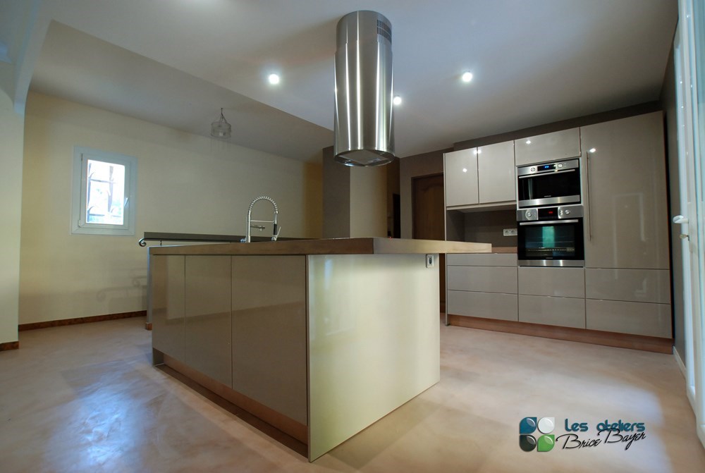 Réalisation d'un ensemble comptoir béton haute perfomance, caissons hauts laqués beige vernis
