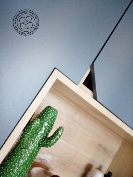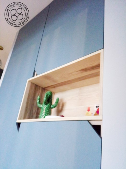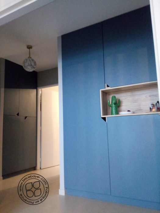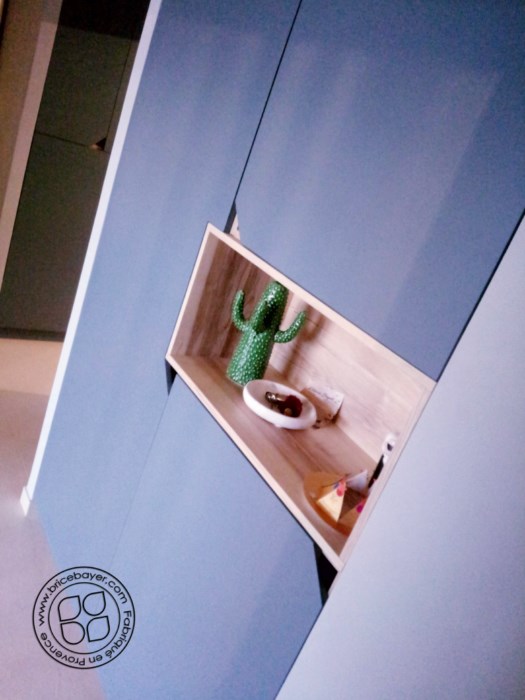 Description : Ensemble mural de placard d'entrée en frêne massif comprenant plusieurs rangements et alcôves. Les poignées sont intégrées directement aux portes de couleur bleu pétrole/ vert cactus. La niche centrale est en frêne massif. La conception, le design & la réalisation sur mesure @bricebayer