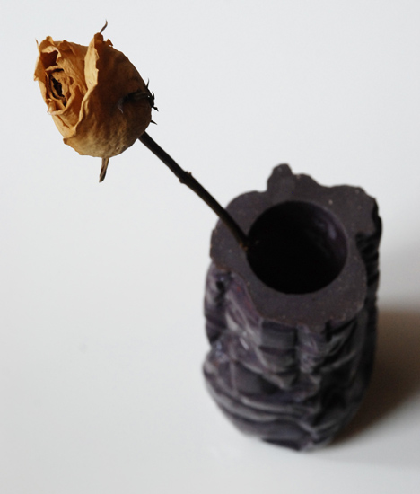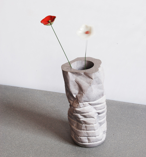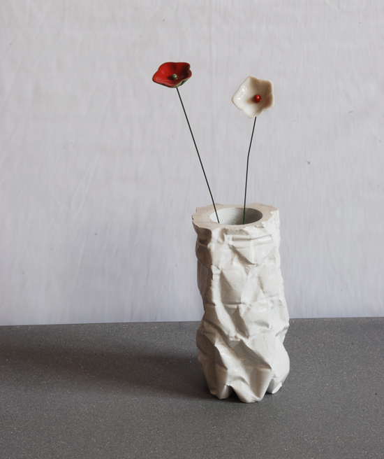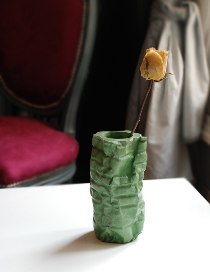 Enfin j'ai pris le partis d'écraser ces bouteilles afin de conférer un caractère unique à chacun de mes vases tout en cherchant à montrer qu''au détour d'un hasard, un produit arrivé en fin de vie peut s'apprécier différemment.
