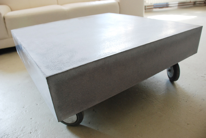 Déscription : Table basse sur roue, plateau en béton haute performance, esprit industriel