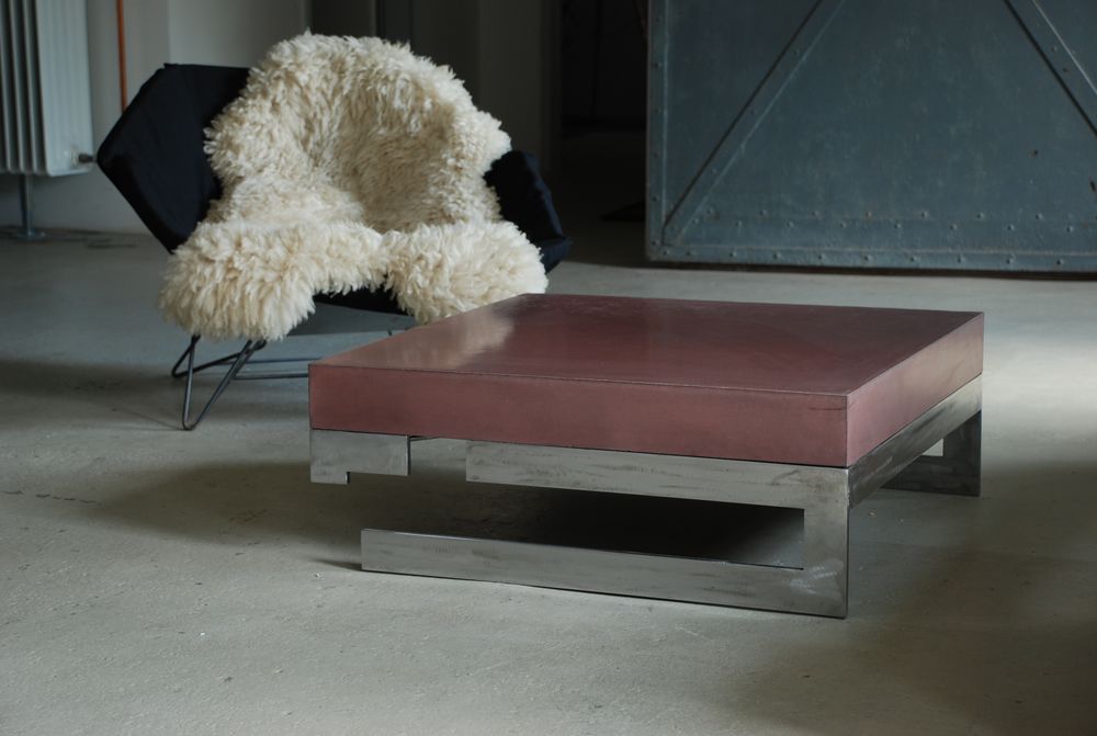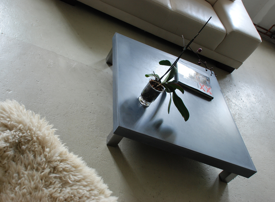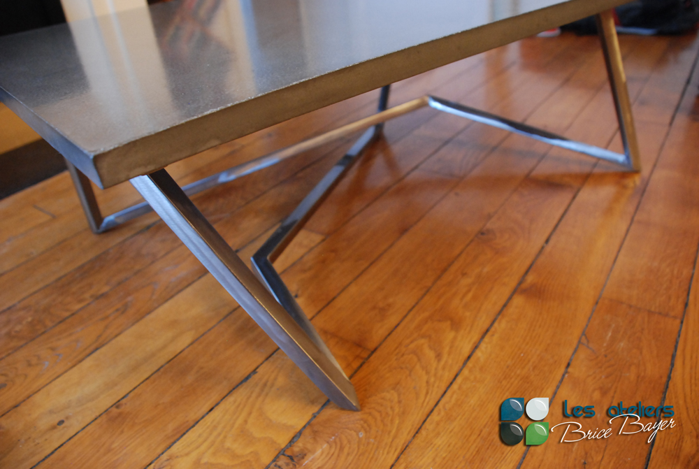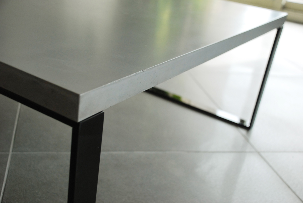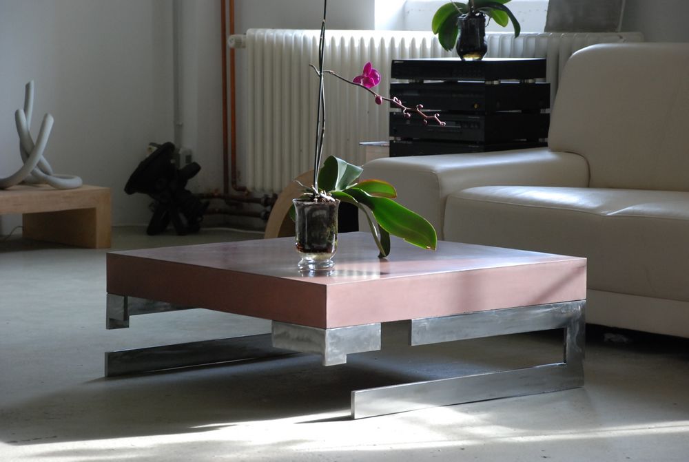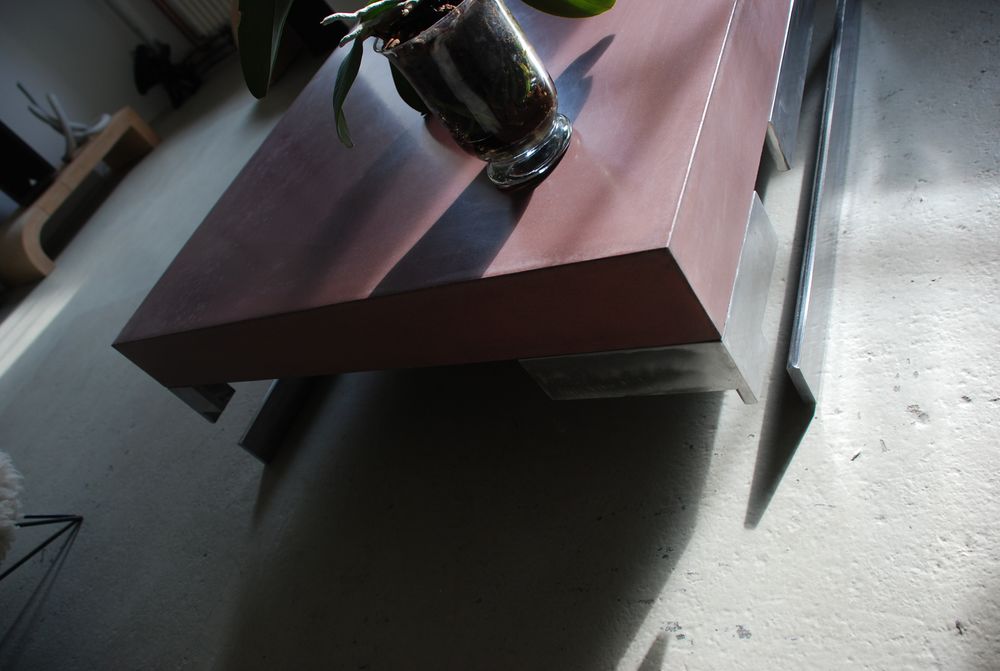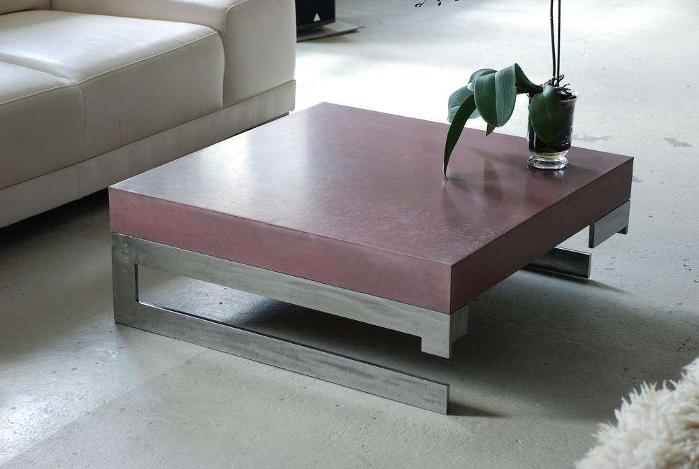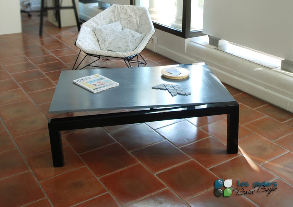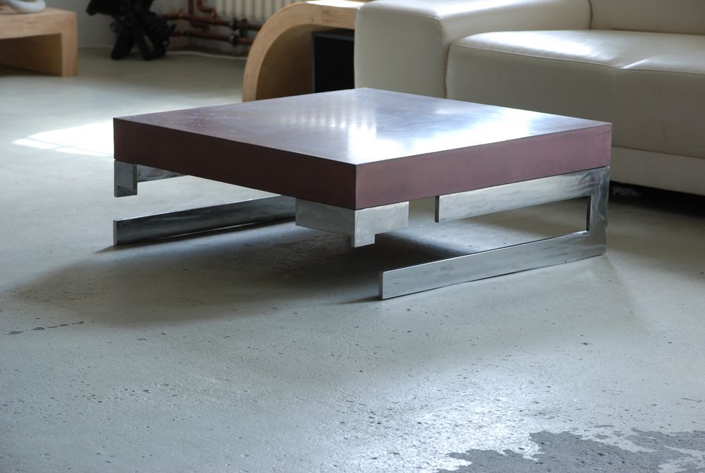 Déscription : Table basse industrielle, plateau en béton haute performance BTHP teinté dans la masse et piètement en acier polis vernis