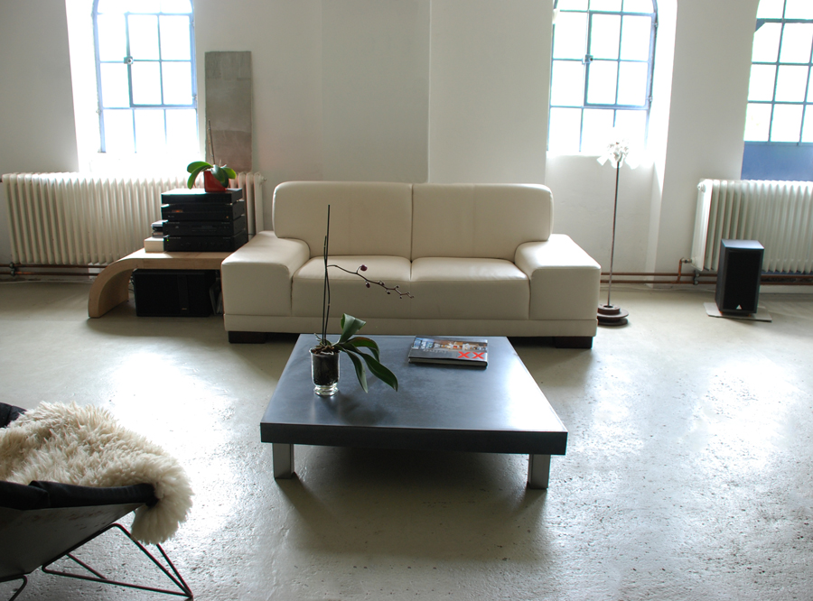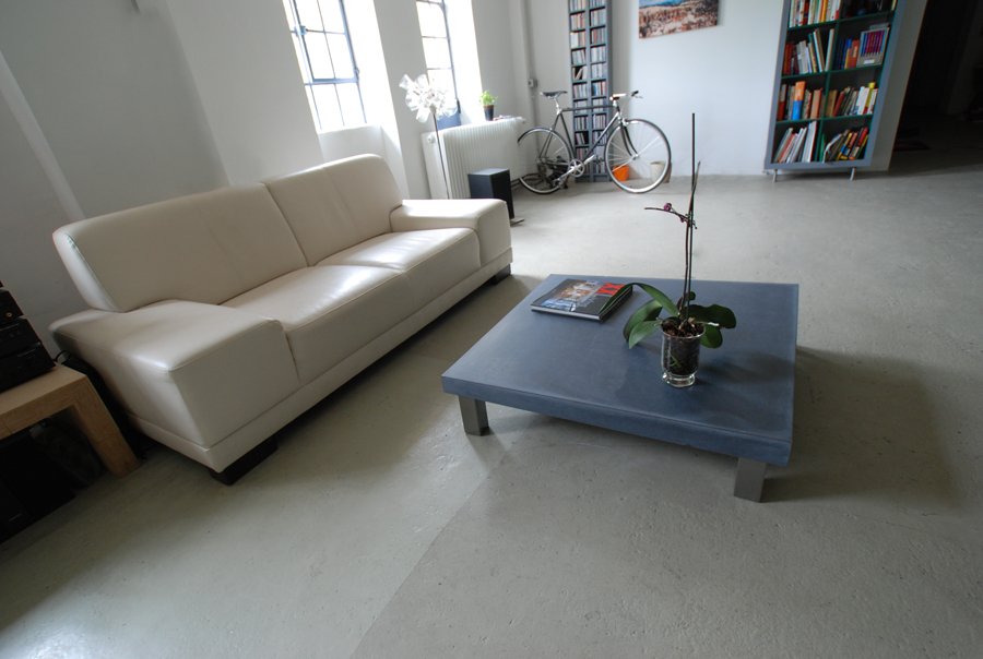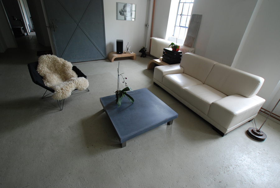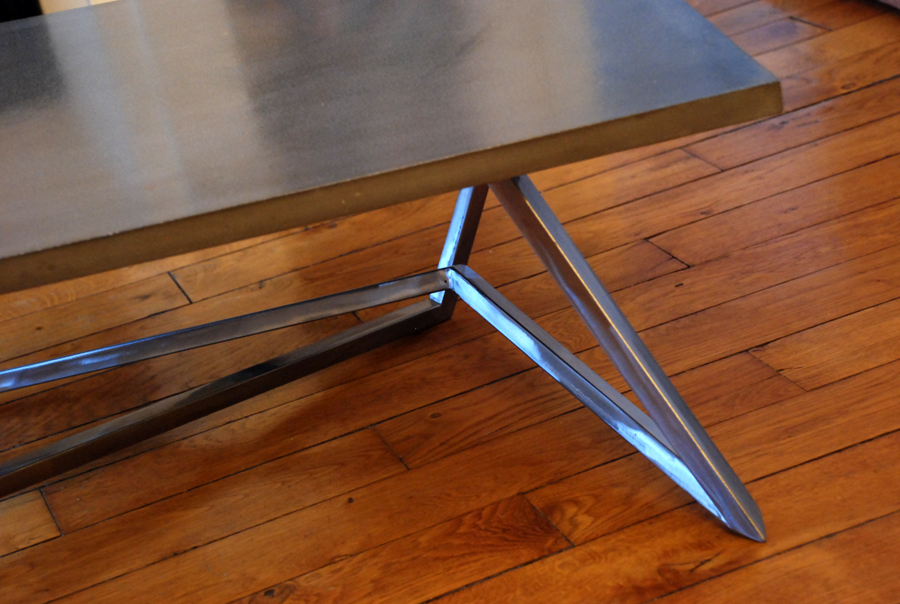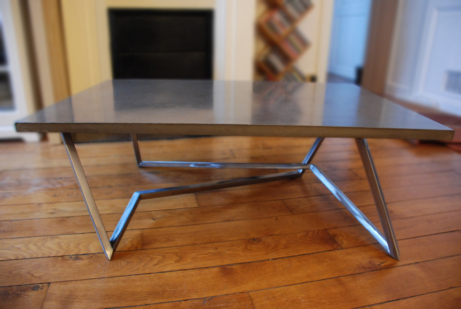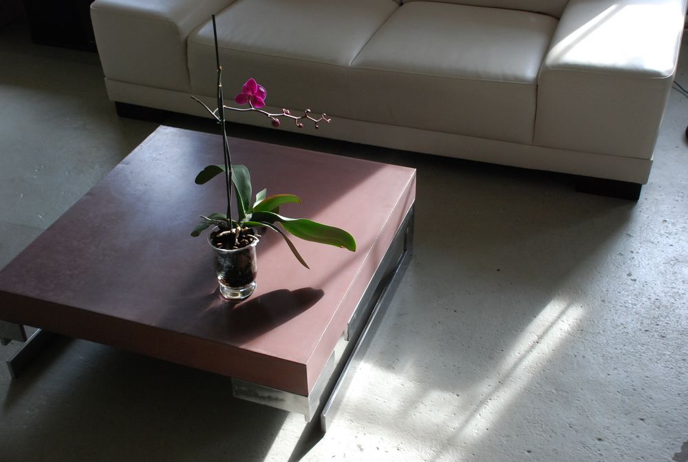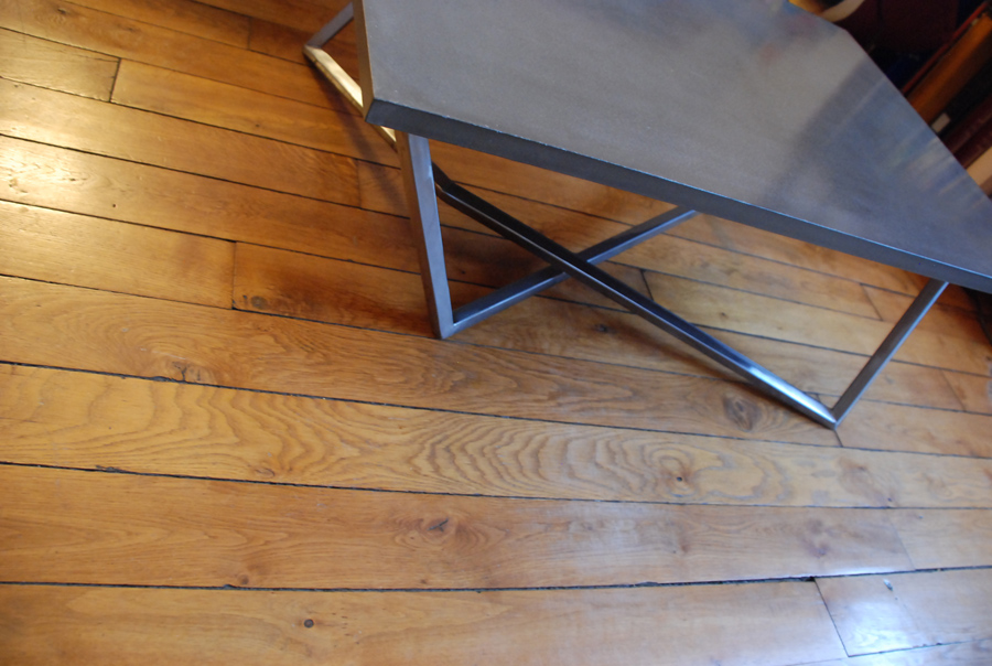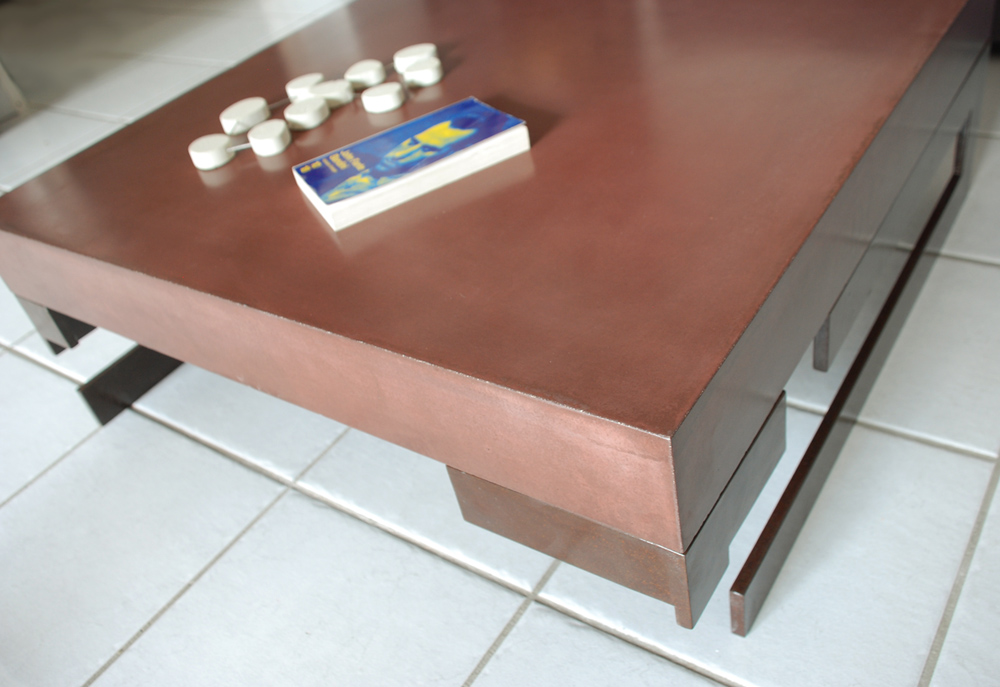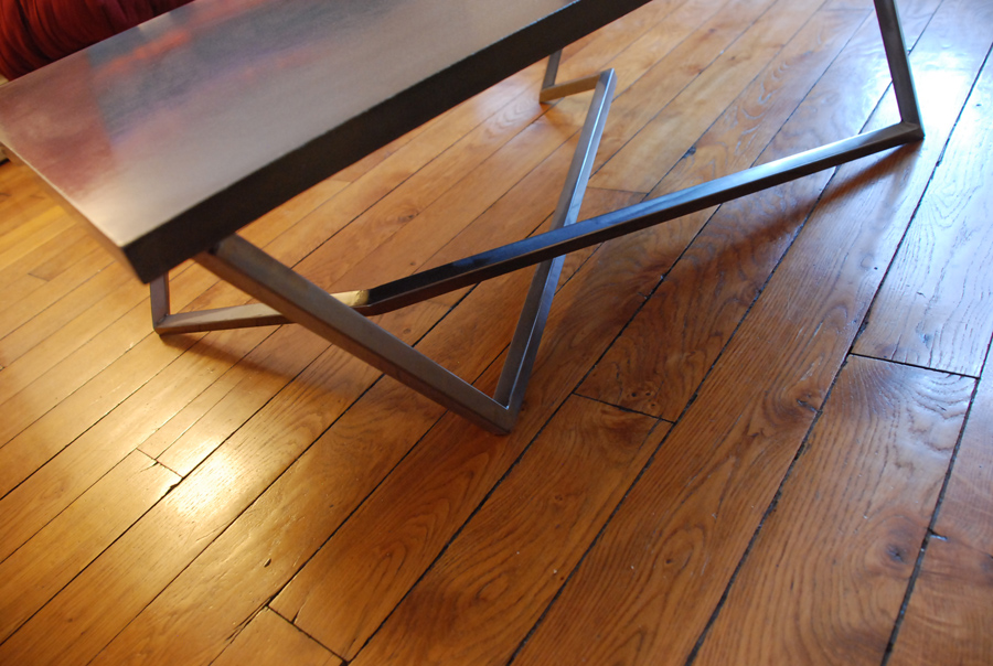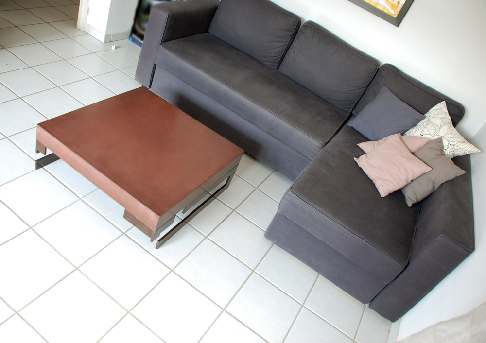Déscription : Table basse industrielle, plateau en béton haute performance BTHP teinté dans la masse et piètement en acier polis vernis