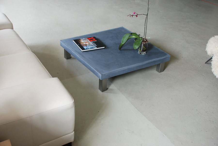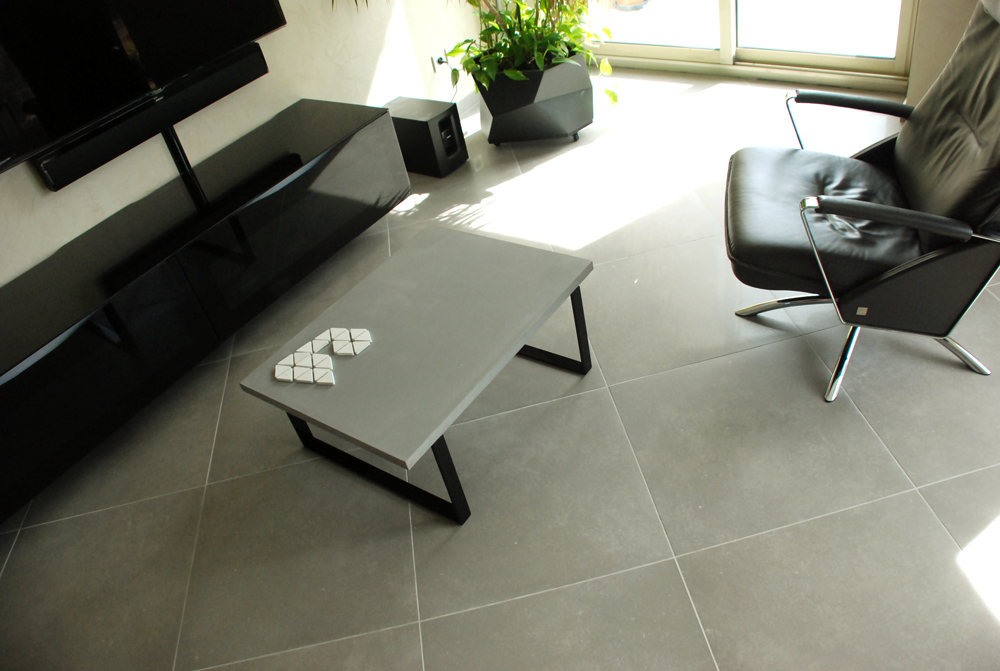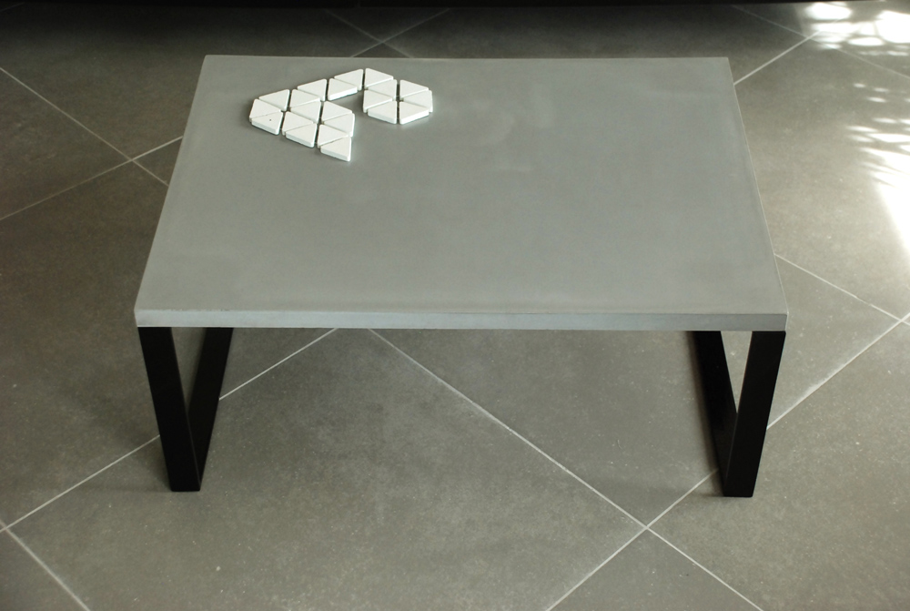 Déscription : table basse Vertigo, plateau béton BTHP, piètement acier finition laquée