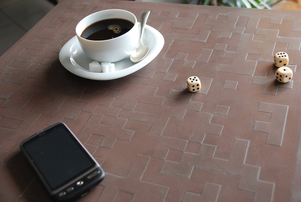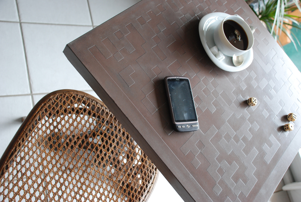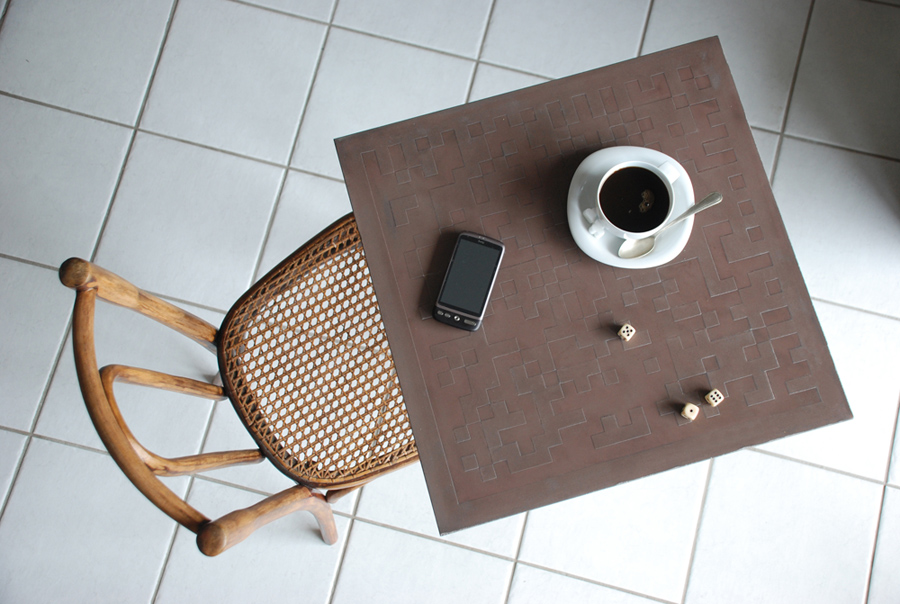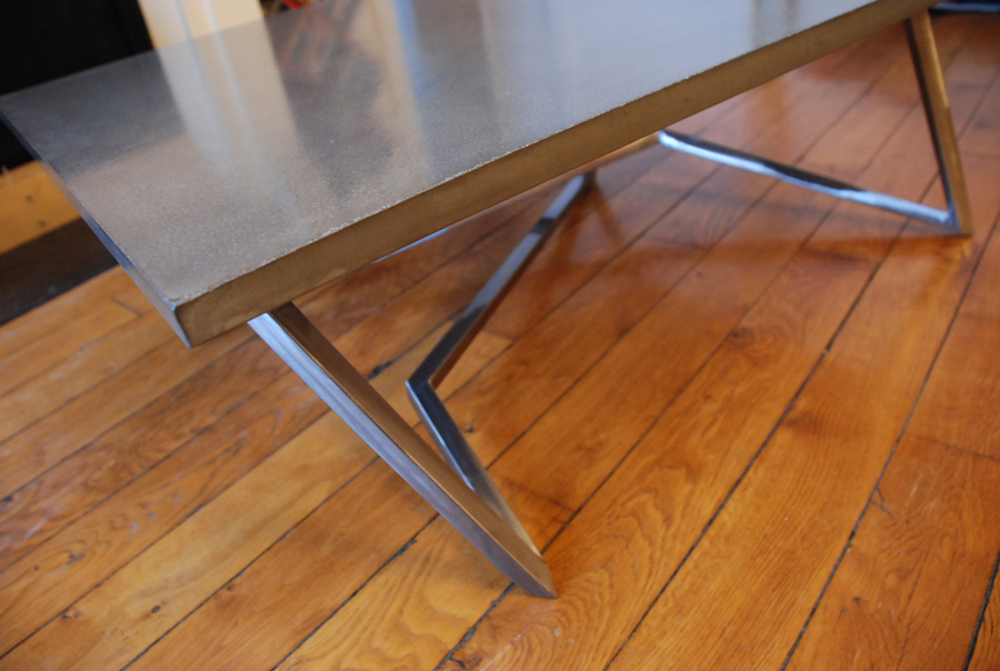 Au premier coup d'œil on peut penser que le large plateau en béton en bascule au dessus du sol ne repose sur aucun élément de soutient ; pourtant en y regardant de plus prêt on constate que non seulement il repose sur quatre pieds massifs en acier brutes et qu'il n'y a pas d'ambiguïté sur le fait que le plateau de la table Vertigo est bien horizontal.