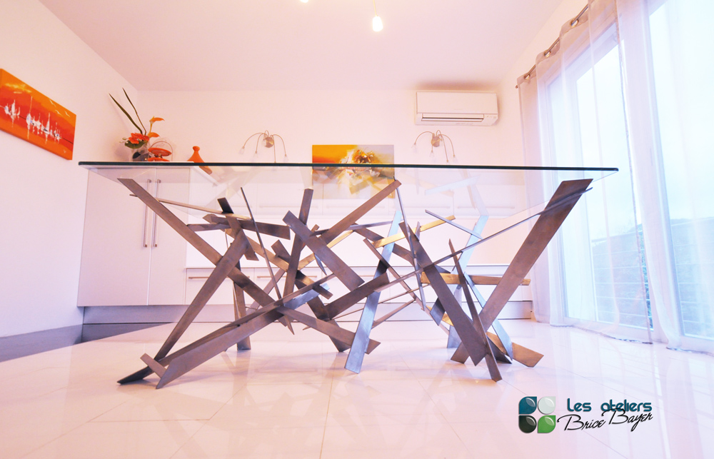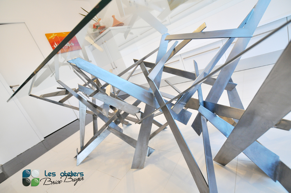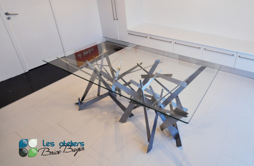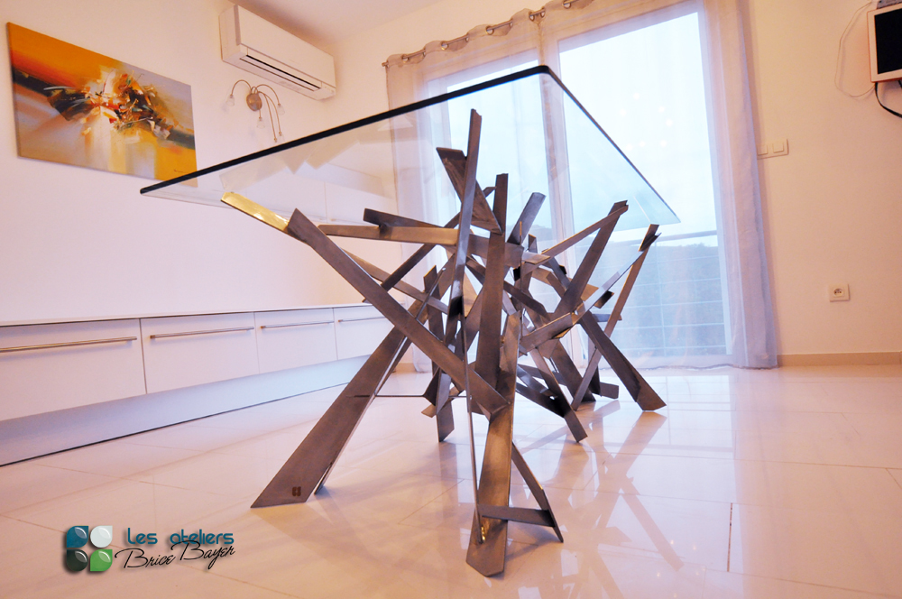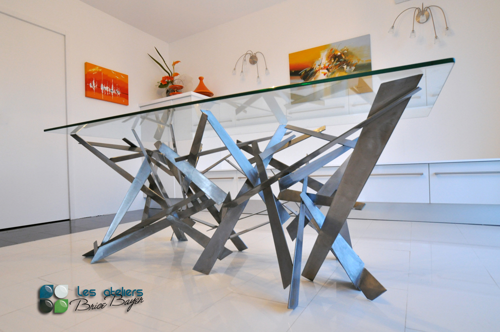 Description : Table en verre design réalisée sur mesure. Piètement en acier brossé, plateau en verre 8mm