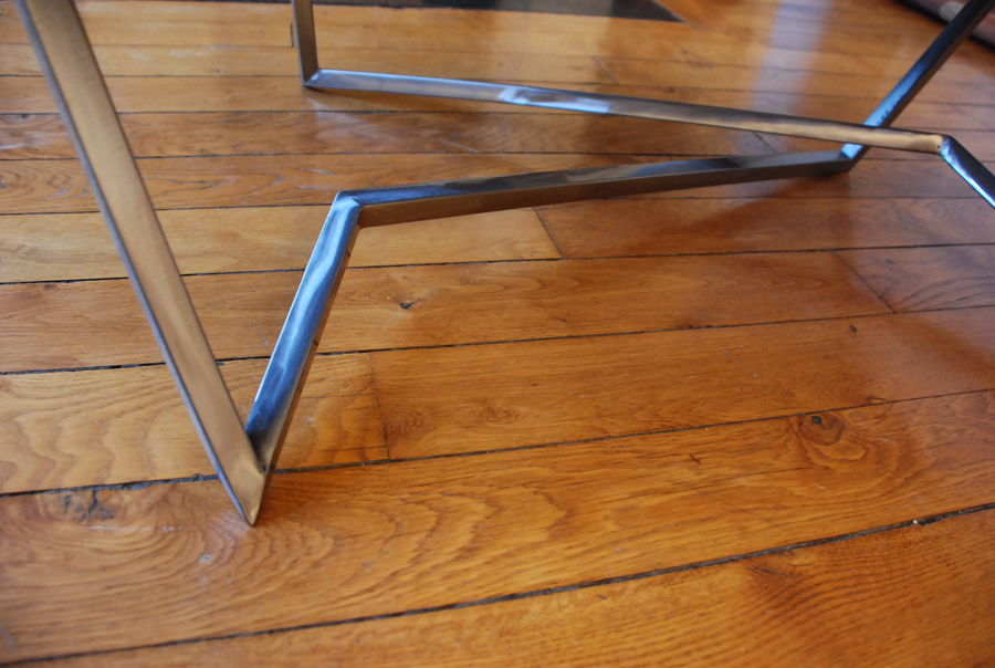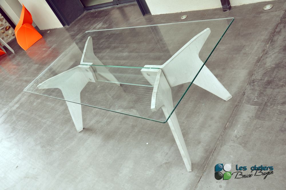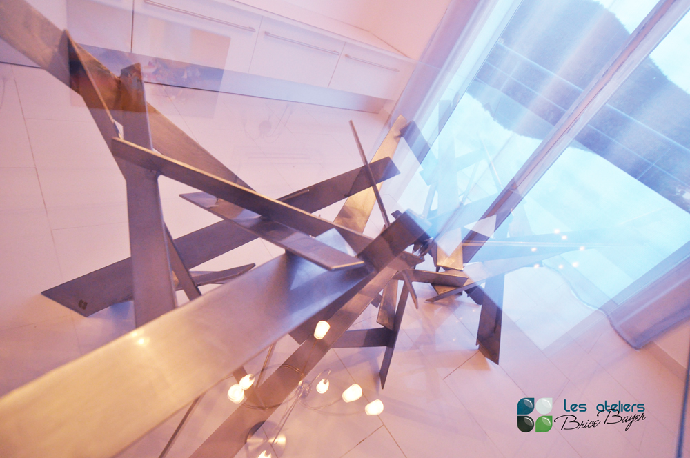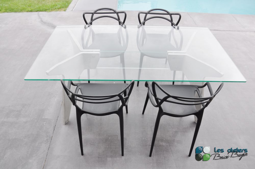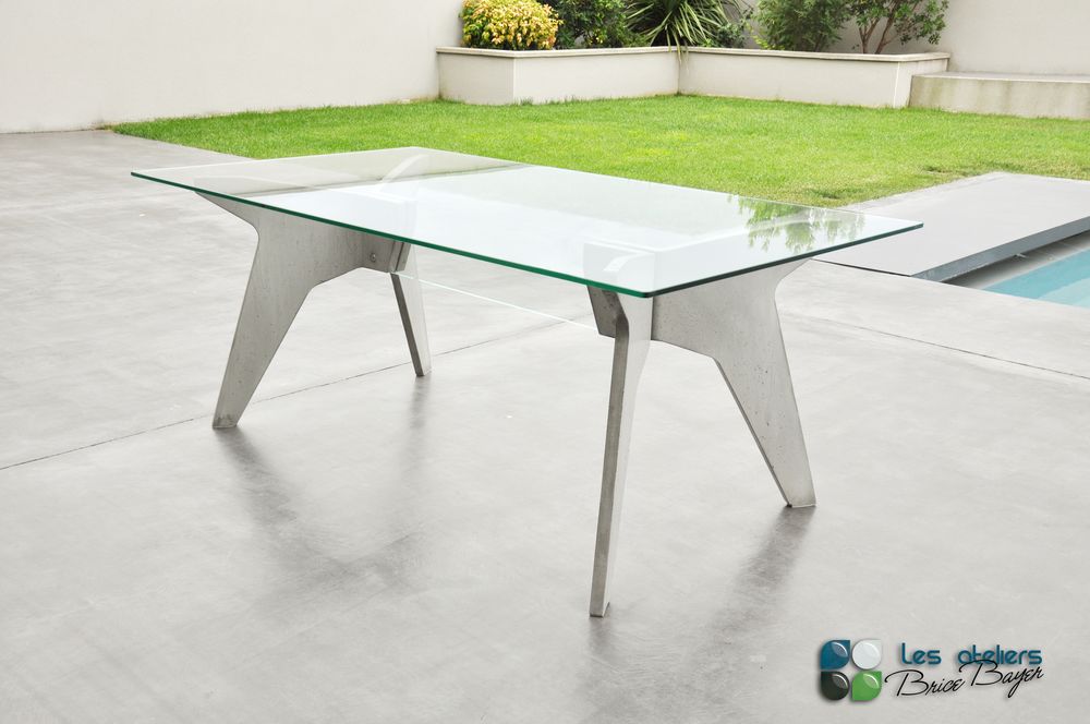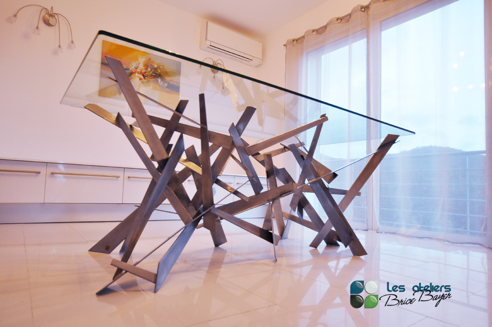 Description : Table en verre design réalisée sur mesure. Piètement en acier brossé, plateau en verre 8mm