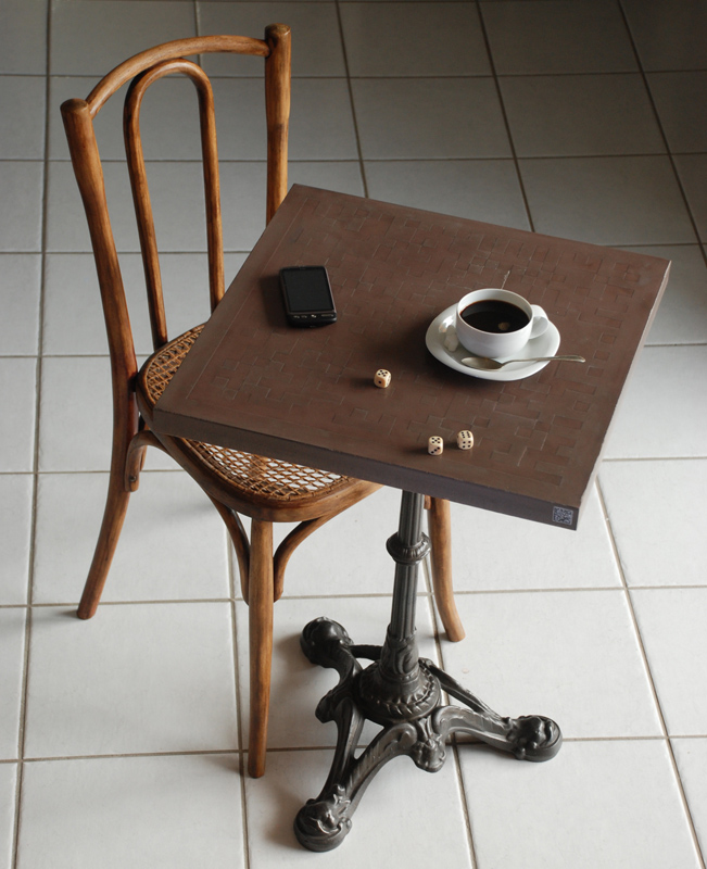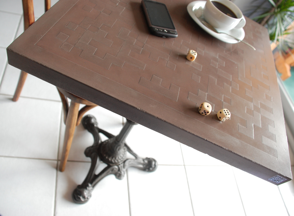 Description : table bistrot en béton haute performance, impression d'un datamatrix sur le plateau, piètement en fonte style art déco