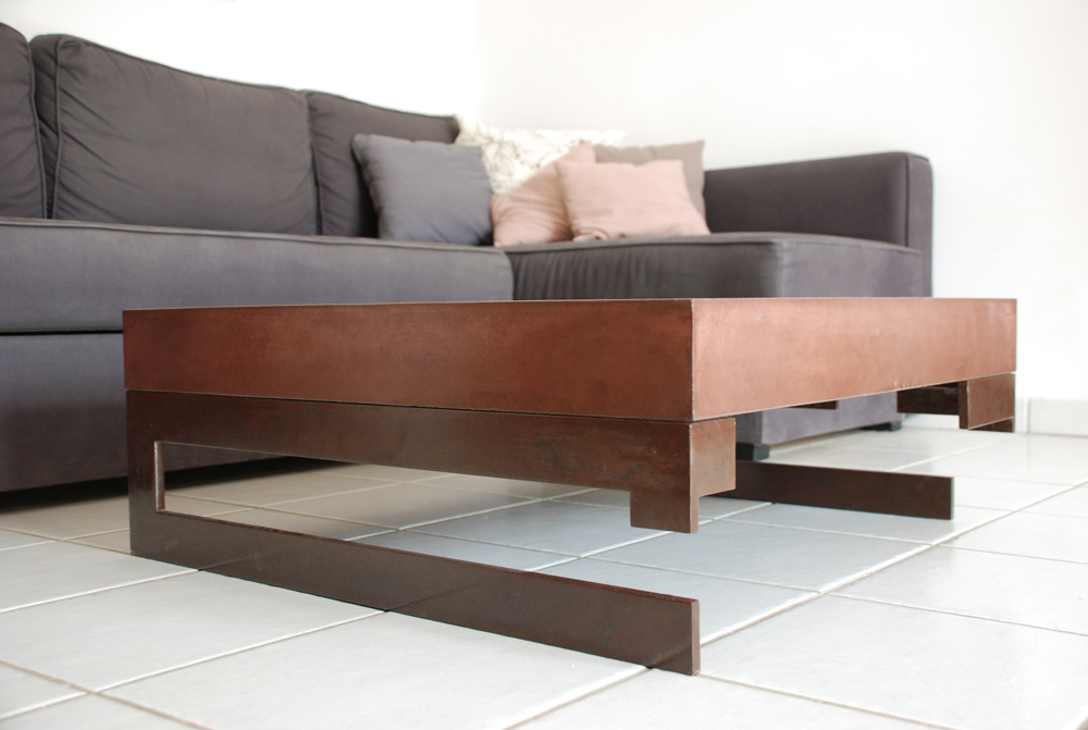 Déscription : Table basse industrielle, plateau en béton haute performance BTHP et piètement en acier rouillé vernis