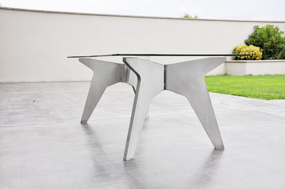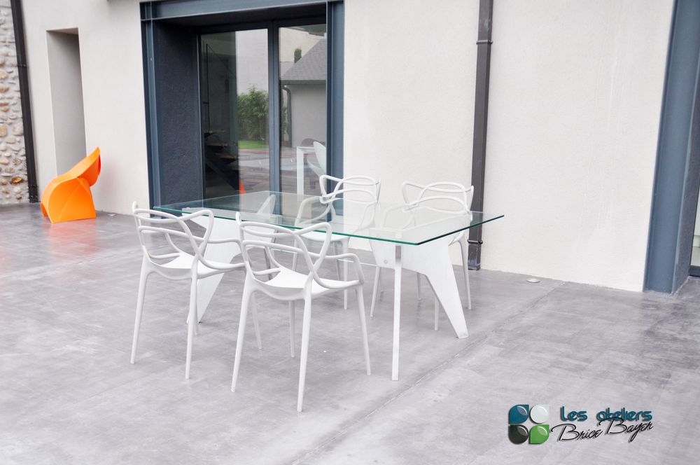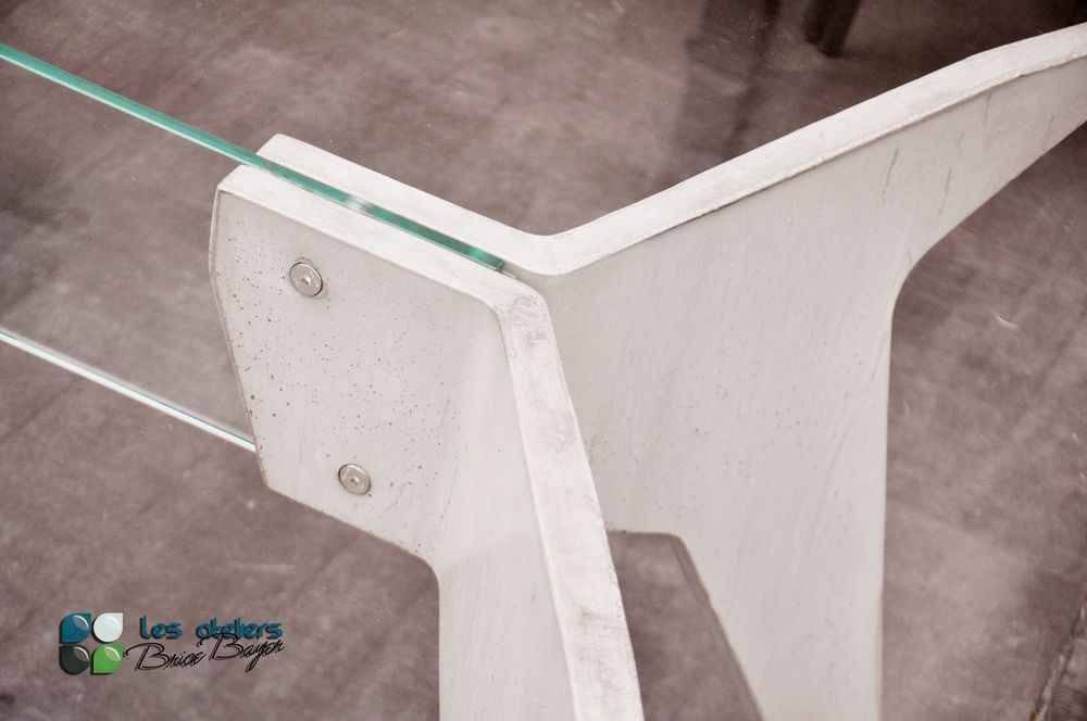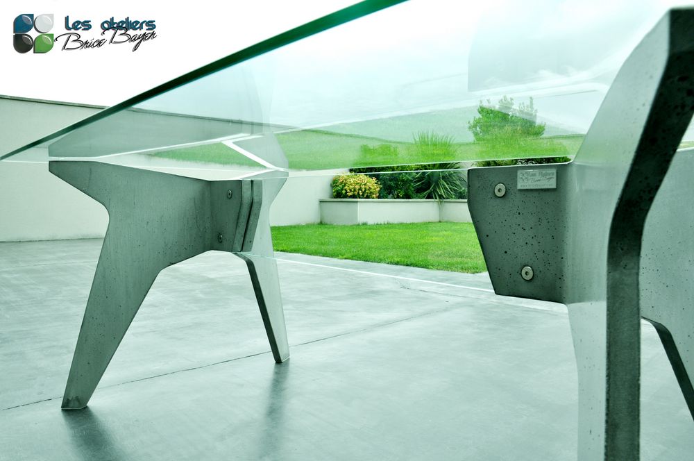 Déscription : table modulable 4 à 12 couverts, piètement en béton haute performance teinté dans la masse, traitement brut. Plateau en verre trempé 8mm