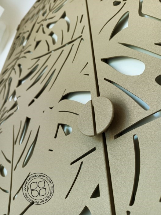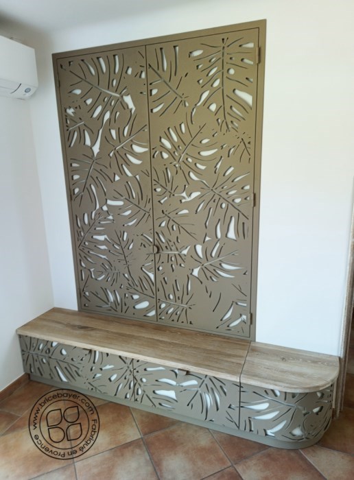 Description : Ensemble mural de rangement en chêne massif orné de découpe laser en acier selon un design floral.
