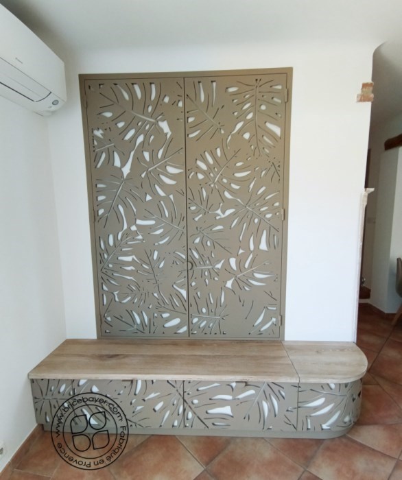 Description : Ensemble mural de rangement en chêne massif orné de découpe laser en acier selon un design floral.
