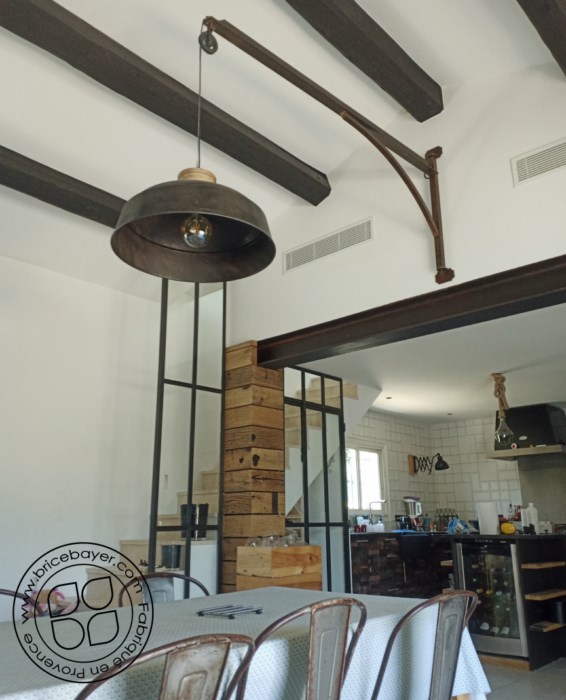 Le luminaire sur messure a été imaginé, conçu et réalisé par nos ateliers. Il s'agit d'une potence industrielle qui permet de déporter le point lumineux.